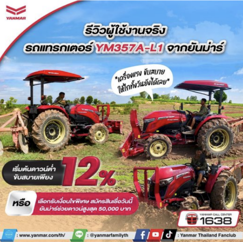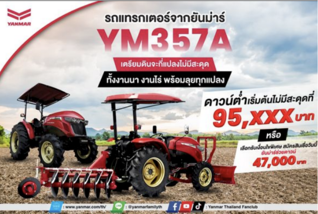 🚜รถแทรกเตอร์จากยันม่าร์ รุ่น YM357A จะเตรียมดินจะกี่แปลงไม่มีสะดุด ทั้งงานนา งานไร่ พร้อมลุยทุกแปลง 🚜 . มาพร้อมกับเทคโนโลยีที่ทันสมัย ล้อใหญ่ขึ้น แรงมากขึ้น สามารถทำงานได้หลากหลาย ไม่ว่าจะงานหรืองานไร่ . 🌈โปรโมชั่นพิเศษจากยันม่าร์ ดาวน์ต่ำเริ่มต้นไม่มีสะดุดที่ 95,XXX บาท หรือเลือกรับเงื่อนไขพิเศษ สมัครสินเชื่อวันนี้ ยันม่าร์ช่วงดาวน์ 47,000 บาท . ✅ มาพร้อมกับระบบ SMARTASSIST หรือ SA-R ที่สามารถตรวจสอบสถานะปัจจุบันของแทรกเตอร์ได้อย่างง่ายดาย . ✅ เครื่องยนต์ ดีเซลไดเรคอินเจคชั่น ขึ้นชื่อเรื่องประหยัดน้ำมันเป็นเยี่ยม เผาไหมหมดจด ทรงพลังทุกการทำงาน . ✅ สามารถทำงานได้หลากหลายรูปแบบ พร้อมลุยทุกสภาพพื้นที่การเกษตร ไม่ว่าจะงานนา งานไร่ หรืองานบุกเบิก . 💬 สอบถามรายละเอียดเพิ่มเติมได้ที่ผู้แทนจำหน่ายยันม่าร์ใกล้บ้าน ***เงื่อนไขเป็นไปตามที่บริษัทกำหนด ————————————– 👨🌾 ติดตามข่าวสารยันม่าร์ได้ที่ Website : https://www.yanmar.com/th/ […]