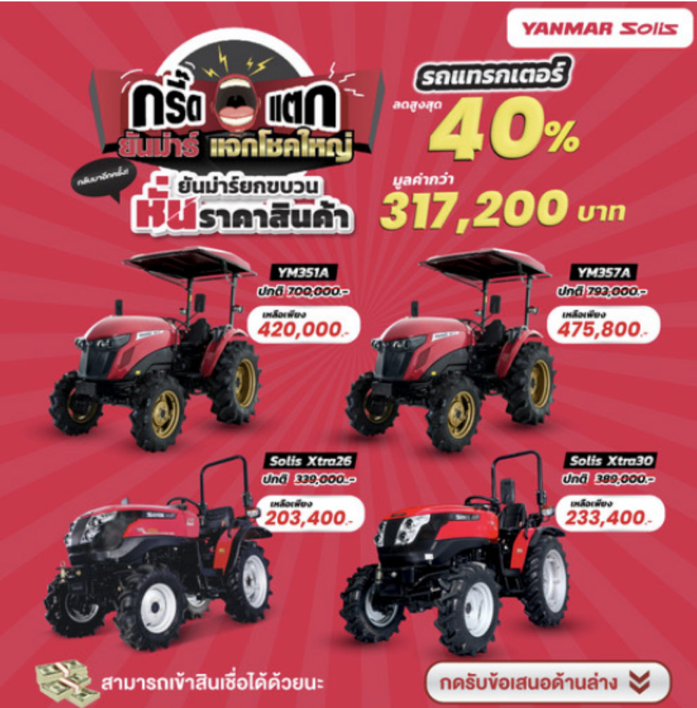📣กรี๊ดแตกยันม่าร์แจกโชคใหญ่📣 ยกขบวนหั่นราคาสินค้าเอาใจชาวเกษตรทุกคน กับรถแทรกเตอร์ที่ลดราคาสูงสุดถึง 40% มูลค่ากว่า 317,200 บาท . ใครที่อยากเป็นเจ้าของรถแทรกเตอร์ ลงทะเบียนด่วน!! 👇 . รุ่นที่ร่วมรายการ ✅YM357A ขนาด 57 แรงม้า ราคาเฉพาะตัวรถ 793,000 บาท ลูกค้าจ่ายเพียง 475,800 บาท ✅YM351A ขนาด 51 แรงม้า ราคาเฉพาะตัวรถ 700,000 บาท ลูกค้าจ่ายเพียง 420,000 บาท ✅Solis Xtra 30HP ขนาด 30 แรงม้า ราคาเฉพาะตัวรถ 389,000 บาท ลูกค้าจ่ายเพียง 233,400 บาท ✅Solis Xtra 26HP ขนาด 26 แรงม้า ราคาเฉพาะตัวรถ 339,000 บาท ลูกค้าจ่ายเพียง […]