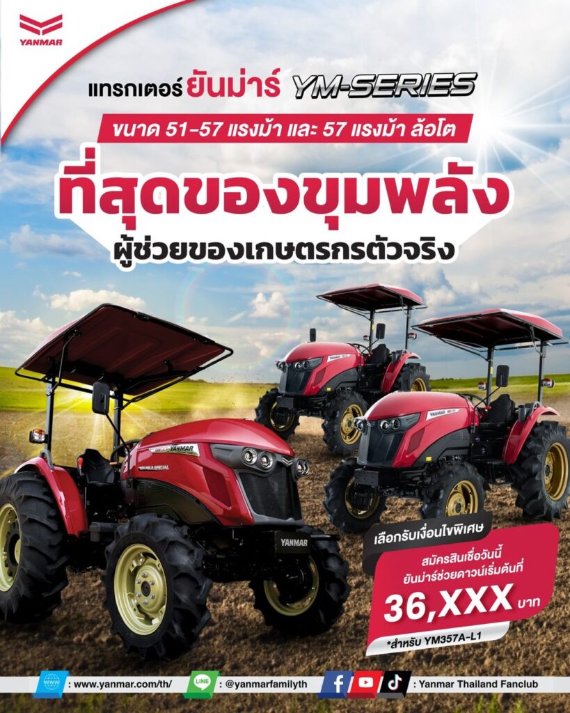 แทรกเตอร์ ยันม่าร์ YM-SERIES ตัวจริงเรื่องงานไร่ ขนาด 51-57 แรงม้า และ 57 แรงม้า ล้อโต ที่สุดของขุมพลัง ผู้ช่วยของเกษตรกรตัวจริง . แทรกเตอร์ที่ทำงานได้หลากหลายรูปแบบ งานนา งานไร่ งานบุกเบิก สามารถลุยได้ทุกที่ทุกสภาพพื้นที่การเกษตรในประเทศไทย ความคงทนสูงสุด แข็งแกร่ง ใช้งานได้ยาวนาน . โปรโมชั่นพิเศษจากบันม่าร์ เลือกรับเงื่อนไขพิเศษ สมัครสินเชื่อวันนี้ ยันม่าร์ช่วยดาวน์เริ่มต้นที่ 36,XXX บาท . สอบถามรายละเอียดเพิ่มเติมได้ที่ผู้แทนจำหน่ายยันม่าร์ใกล้บ้าน ***เงื่อนไขเป็นไปตามที่บริษัทกำหนด ————————————– ติดตามข่าวสารยันม่าร์ได้ที่ Website : https://www.yanmar.com/th/ Facebook : https://bit.ly/3HH56vc Youtube : https://bit.ly/3nEeIin TikTok : https://vt.tiktok.com/ZSePbJTdd/ Call Center : 1638